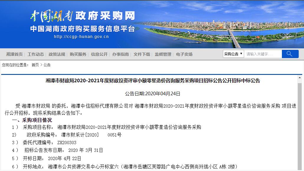 湘潭市財政局2020-2021年度財政投資評審小額零星造價咨詢服務(wù)采購項目招標(biāo)公告公開招標(biāo)中標(biāo)公告